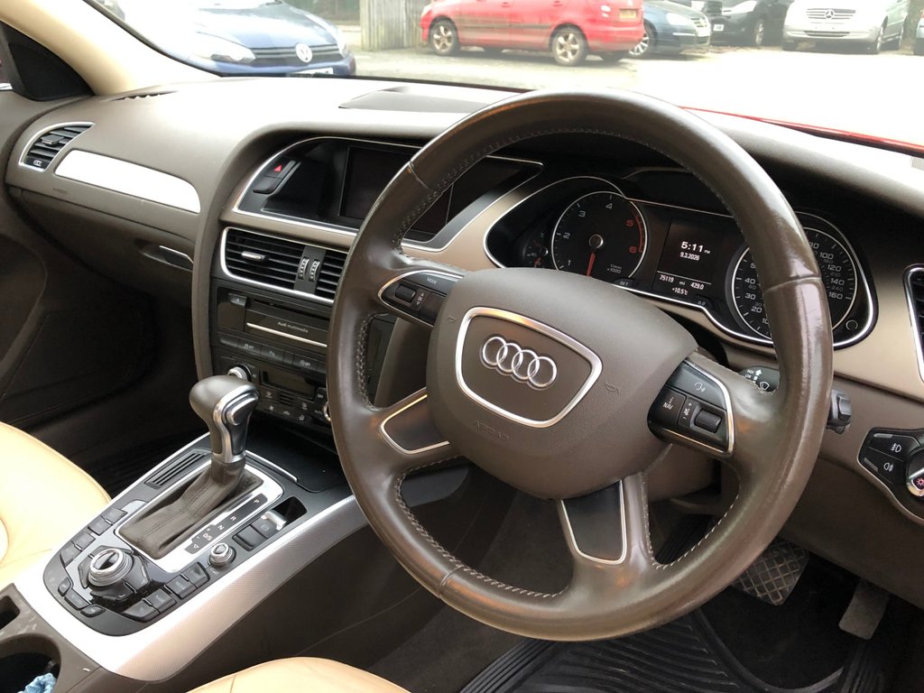 Here is a really well looked after 1 owner 2012 Audi A4 2.0 Tdi Se Technik edition that has covered 75000 miles with a full service history 18000, 32000, 39000 (inc Cambelt), 45000, 52000, 56000, 60000, 65000, 68000, 72000, 74000 Â including a cambelt change. Finished in brilliant red gloss with lovely full velvet beige Milano leather interior with 17" alloy wheels. it is in super condition inside & out and drives very well. Specification includes electric glass sunroof, electric seats with memory, satelitte navigation, cruise control, front & rear parking sensors, elctric heated folding door mirrors, leather multi function steering wheel, convenience pack, auto lights and auto wipers, bluetooth, isofix, and remote central locking with 2 keys. See more at carsofchichester.co.uk. All cars are Hpi checked and include a national warranty. We are open 7 days a week and do not charge admin fees.