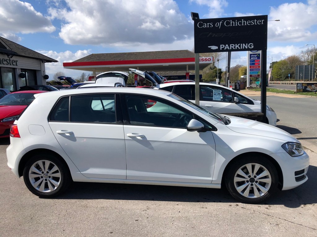 **JUST ARRIVED AWAITING FULL PREPERATION** Popular mid 2014 3 Volkswagen Golf 1.4 TSI SE Bluemotion technology 6 speed manual petrol 5 door hatchback featured in white which has covered 70,000 miles. Fantastic service history recorded at 5,000, 11,000, 16,000, 22,000, 29,000, 33,000, 35,000, 38,000, 41,000, 44,000, 52,000, 54,000 (cambelt and waterpump), 64,000, and 68,000 miles. Specification is generous which includes DAB radio, 8 inch touch screen, front fog lights, bluetooth phone and audio, 16-inch Toronto alloy wheels, adaptive cruise control, collision assist, remote central locking with 2 keys, electric windows,+mirrors, autolighrs and rain sensing wipers, rear child isofix. Economical to run with just £35 annual road tax and 53.3 mpg combined fuel consumption. Ulez compliant. In good condition inside and out; drives well. All of o All of our cars come with a national parts and labour warranty. We also offer finance and a part exchange service. HPI checked and we do not charge admin fees. To find out more visit carsofchichester.co.uk or call us on 01243781111.